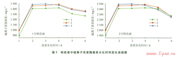 圖5中吸收液中硫離子濃度在基漿水化2 d后基本達(dá)到最大值,原因是此時(shí)膨潤(rùn)土造漿效果最好,膨潤(rùn)土比表面積較大;2~4 d內(nèi)吸收液中硫離子濃度無(wú)明顯變化;5~6 d吸收液中硫離子濃度開始降低。分析原因是基漿放置5 d后,底部有明顯的膨潤(rùn)土固體分層現(xiàn)象,膠體穩(wěn)定性變差所致[7]。因此確定基漿最佳水化時(shí)間為2 d。