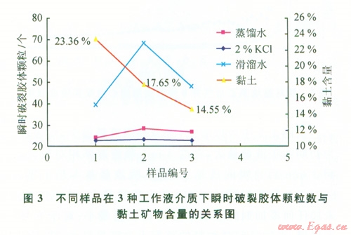 2顯示了頁(yè)巖的水化分散速度(m)與黏土礦物含量的關(guān)系。2KCl及蒸餾水在高黏土礦物含量下,具有較好的抑制性能,而在低黏土礦物含量下,其抑制性能對(duì)黏土礦物含量的變化不敏感;而滑溜水的抑制性能相對(duì)較差,但其抑制性能與黏土含量相關(guān)。圖3顯示了瞬時(shí)形成膠體顆粒數(shù)目(b)值與黏土礦物含量的關(guān)系。3種液體都顯示出在高黏土礦物含量情況下,抑制性能較好。