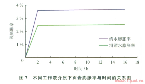 通過將人工制備的巖心放置在工作筒中,測(cè)試不同工作液介質(zhì)下巖心的軸向線膨脹率,根據(jù)實(shí)驗(yàn)結(jié)果可繪制巖心線膨脹率與時(shí)間的關(guān)系曲線,比較不同工作液介質(zhì)下巖心的膨脹特征。