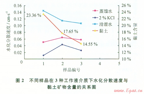 從表2可以看出:①l號(hào)樣品測(cè)試結(jié)果中,2KCl的頁(yè)巖的水化分散速度(m)值最小,瞬時(shí)形成膠體顆粒數(shù)目(b)值也最?。欢锼?span lang="EN-US">A號(hào)兩項(xiàng)參數(shù)均最高。②2號(hào)和3號(hào)樣品測(cè)試結(jié)果與l號(hào)樣品結(jié)果規(guī)律一致。