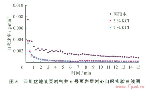 從圖4、5中可以看出:總的吸液量極少,均表現(xiàn)為初期的吸液量最大,在前3 min吸液速率相對(duì)較大,而3 min后自吸曲線趨于平直,吸液量基本趨于零。②對(duì)于5號(hào)頁(yè)巖層,3KCl的自吸量最大,7KCl及未加任何添加劑的蒸餾水巖心自吸量最?。粚?duì)于6號(hào)頁(yè)巖層,未加任何添加劑的蒸餾水自吸量最大,3KCl7KCl的自吸量最小。不同層段的頁(yè)巖吸液量具有明顯的差異,與黏土礦物含量相關(guān),黏土礦物含量較高的5號(hào)巖心吸液量高于含量較低的6號(hào)巖心。