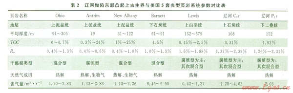 將研究區(qū)2套泥頁(yè)巖層與美國(guó)主要產(chǎn)氣頁(yè)巖層各項(xiàng)參數(shù)對(duì)比,結(jié)果發(fā)現(xiàn):遼河坳陷東部凸起上古生界泥頁(yè)巖地化參數(shù)較好(表2),進(jìn)一步表明該區(qū)上古生界泥頁(yè)巖具備頁(yè)巖氣存在的條件,具有很好的開(kāi)發(fā)潛力,可作為頁(yè)巖氣下一步要尋找的目標(biāo)。