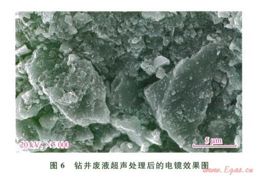 對鉆井廢液在超聲波作用前后進(jìn)行電鏡掃描分析,效果如圖5、6所示。