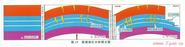 通過裂縫演化分析認(rèn)識到(圖13):受膏鹽巖“上拱”影響,西區(qū)構(gòu)造變形處砂巖常發(fā)育高角度構(gòu)造縱張縫。受龍門山南動向應(yīng)力擠壓,是砂巖間的薄層泥巖發(fā)生層間錯動,從而形成近水平層間滑脫縫。構(gòu)造縫+層間縫=網(wǎng)狀裂縫是儲層重點目標(biāo)。
