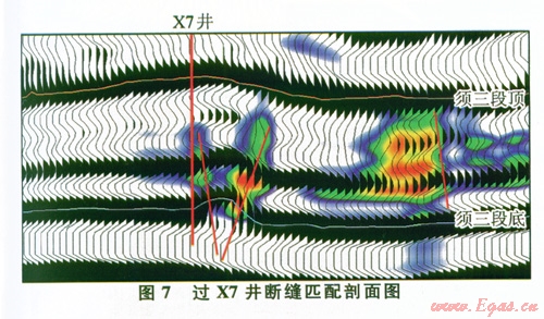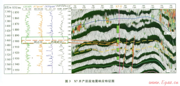 通過合成地震記錄標(biāo)定,確定X7井須三段鈣屑砂巖儲層為強振幅地震反射特征,砂體頂?shù)追謩e對應(yīng)強波峰或者強波谷;地震剖面上測試段砂體表現(xiàn)為“透鏡狀”反射特征,表明砂體為分流主河道砂體;X7井測試段東部