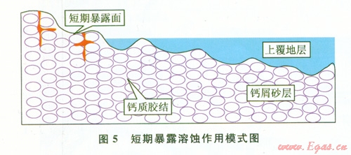 早期短期暴露溶蝕作用是指在砂巖沉積后,由于砂體處于短期的古地理高部位,短期內(nèi)后期沉積物沒有覆蓋到沉積地層,或者沉積后存在小范圍的不整合面,導(dǎo)致大氣淡水以及地表滲流水對易于溶蝕的鈣屑砂巖地層進(jìn)行溶蝕、滲透,在靠近地表地區(qū)形成一定規(guī)模的溶蝕縫洞系統(tǒng)(圖5)[5]。但早成巖階段形成的溶蝕縫洞規(guī)模有限,在中-晚期成巖階段容易被膠結(jié)、壓實、充填,對儲層孔隙建設(shè)的作用非常有限。