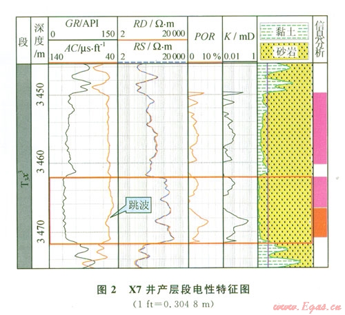 X7井須三段產(chǎn)層段砂體表現(xiàn)為很低的伽馬值(30API),測井電阻率遠(yuǎn)遠(yuǎn)高于上部砂體(800~1 000 Ω· m),反映砂體致密,并且含有較多的鈣質(zhì)碎屑,低聲波時差55μs/ft(