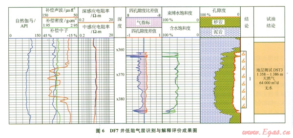 圖5、6分別為DF3井與DF7井低阻氣層識別與解釋評價成果圖。其中前3道為常規(guī)原始曲線,氣層段的電阻率極低,約1.7 Ω·m,與上下泥巖層電阻率極為接近,是典型的低阻氣層。該氣層只用電阻率曲線是無法判斷的,直接由密度、中子、聲波測井曲線判斷也比較困難。第5道為含氣指示,利用四孔隙度比值(藍(lán)色線)與差值(粉紅色線)曲線重疊的方法直觀反映氣層與水層。第6道為利用文中所述的方法計(jì)算得到的含水飽和度與束縛水飽和度曲線。