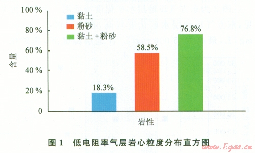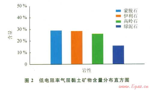 根據(jù)薄片鑒定分析和粒度分析資料,東方區(qū)塊低電阻率氣層巖性主要為由細(xì)-極細(xì)粒的石英粉砂和泥質(zhì)組成的泥質(zhì)粉砂巖。圖1為低阻氣層巖心粒度分析的黏土與粉砂含量分布直方圖,可見低阻氣層巖石顆粒成分主要為黏土與粉砂,二者之和約為80%。圖2為低阻氣層巖心X射線衍射分析得到的黏土礦物分布直方圖,由圖可見,低阻氣層的黏土礦物主要為蒙脫石與伊利石,兩者的含量總和達(dá)到60%。細(xì)顆粒巖性對儲層電阻率的影響主要體現(xiàn)在以下兩方面:①儲層中細(xì)顆粒成分越多,巖石的比表面積就會越大,顆粒表附大量的束縛水,增強(qiáng)巖石導(dǎo)電性;②小巖粒含量越高,地層中小孔隙和小喉道就越發(fā)育,使巖層中殘余水(束縛水)含量急劇升高,這又增強(qiáng)了巖石導(dǎo)電性,使地層電阻率下降。由此可見,巖性細(xì)是形成東方區(qū)塊部分氣層低電阻率特性的基本地質(zhì)環(huán)境[3-5]。