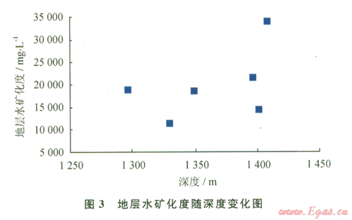 圖3為東方氣田地層水礦化度特征圖。由圖3可見,東方氣田地層水礦化度較高,在15 000~25 000mg/L,最高為35 000 mg/L。在地層溫度下,高礦化度地層水是一種很好的導(dǎo)電體。