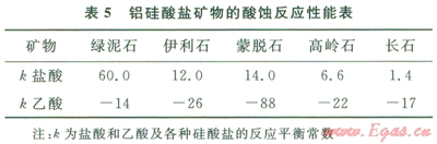 有學(xué)者研究了鹽酸與各種鋁硅酸鹽礦物的反應(yīng)動力學(xué),并將反應(yīng)速度常數(shù)的對數(shù)值為50時(shí)對應(yīng)的溫度(T50)作為各種鋁硅酸鹽在鹽酸中保持穩(wěn)定的溫度上限,各種鋁硅酸鹽的T50值如表5所示。表5同時(shí)也給出了根據(jù)熱力學(xué)數(shù)據(jù)計(jì)算出來的鹽酸與醋酸與各種鋁硅酸鹽礦物反應(yīng)的平衡常數(shù)??梢钥闯?,在熱力學(xué)上,這些鋁硅酸鹽均可以溶于鹽酸,但幾乎完全不溶于醋酸;而在動力學(xué)上,沸石在鹽酸中最不穩(wěn)定,綠泥石次之,長石最穩(wěn)定。在儲層中占優(yōu)勢的鋁硅酸鹽礦物的T50低于儲層溫度時(shí),應(yīng)該考慮在酸化液中用乙酸代替鹽酸[6-8]。