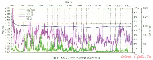 Y37-2H井應(yīng)用的哈里伯頓公司FEWD隨鉆地質(zhì)導(dǎo)向儀器能夠隨鉆實時測量傳輸2條伽馬曲線和特淺、淺、中、深4條電阻率曲線,為現(xiàn)場地質(zhì)導(dǎo)向提供隨鉆地質(zhì)參數(shù)[4]。