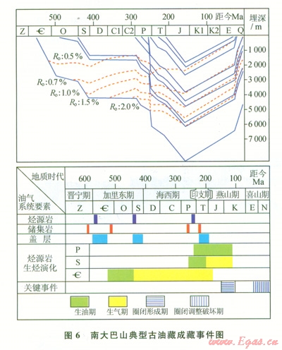 結(jié)合南大巴山的構(gòu)造發(fā)育史,該區(qū)油氣藏成藏過程可以分為3個(gè)階段:晚三疊世—早侏羅世開始變形,形成寬緩背斜,形成古油藏;中侏羅世—早白堊世進(jìn)一步變形,圈閉構(gòu)造定型,部分古油藏裂解,形成油氣藏;古近紀(jì)喜山運(yùn)動(dòng)對(duì)先期構(gòu)造進(jìn)行了強(qiáng)烈的改造,造成古油氣藏的調(diào)整與破壞。