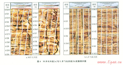 飛仙關(guān)組輸導(dǎo)體主要由鮞?;?guī)r儲(chǔ)集體和裂縫構(gòu)成(圖2-b)。根據(jù)儲(chǔ)層段巖心物性的統(tǒng)計(jì)分析(圖3-b),絕大多數(shù)樣品點(diǎn)的孔滲相關(guān)性較好,只有極個(gè)別樣品點(diǎn)滲透率異常,說明飛仙關(guān)組的裂縫不發(fā)育,主要為孔隙型儲(chǔ)集空間。結(jié)合成像測(cè)井分析(圖4-b),與長興組相比,飛仙關(guān)組動(dòng)態(tài)圖像表現(xiàn)為大套塊狀鮞?;?guī)r特征,裂縫相對(duì)不發(fā)育,動(dòng)態(tài)圖像的色級(jí)以黃褐色為主,色級(jí)分布較穩(wěn)定,巖性較純而密,物性較差,裂縫與孔隙呈配置較差,輸導(dǎo)效率沒有長興組高。