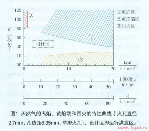 同樣,如用同一種燃?xì)庠谝粋€(gè)已定的燃燒器上對(duì)不同火孔負(fù)荷和已知燃燒器頭部溫度條件下進(jìn)行運(yùn)行試驗(yàn),就可得到該燃?xì)馔暾碾x焰和黃焰端的極限特性曲線。同時(shí)也指明了發(fā)生離焰和黃焰端時(shí)相應(yīng)一次空氣百分?jǐn)?shù)的最大值和最小值。