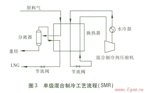 單級混合制冷工藝流程(簡稱SMR)。原料氣通過冷箱中的換熱器,與混合制冷劑換熱,天然氣被冷卻液化?;旌现评鋭┫纫来谓?jīng)壓縮機增壓、冷卻器冷卻,然后不進行氣液分離、直接進入換熱器預(yù)冷,再出換熱器節(jié)流降壓降溫,再回到換熱器,與天然氣換熱使之液化,同時自身氣化成氣態(tài)混合制冷劑,返回壓縮機。單級混合制冷工藝流程見圖3。