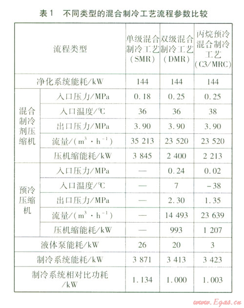 針對LNG產(chǎn)量小于220 td,原料氣壓力、流量、溫度分別為4.7 MPa、315 000 m3d、40℃LNG產(chǎn)品溫度、壓力、流量分別為-l60.2 ℃、0.02 MPa300 090 m3d的較小基本負(fù)荷型裝置,運用美國進口的化工流程模擬軟件,比較了這3種混合制冷工藝流程的主要技術(shù)參數(shù),見表1。