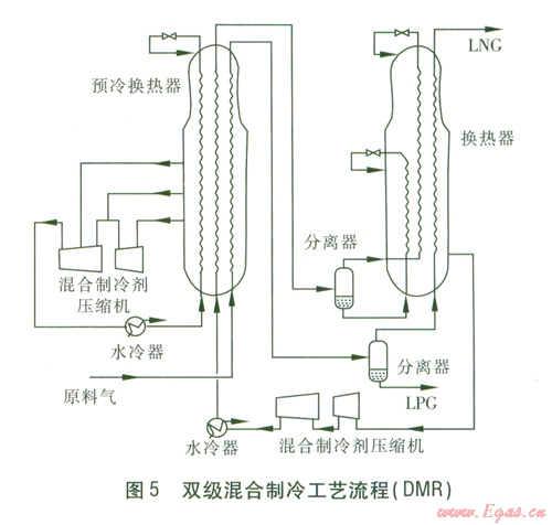 雙級混合制冷工藝(簡稱DMR)。采用乙烷、丙烷與少量甲烷、丁烷混合物為預(yù)冷流程制冷劑,將天然氣從常溫預(yù)冷到-40 ,再由混合制冷劑循環(huán)將天然氣進一步冷卻至-l60℃而液化。雙級混合制冷工藝流程見圖5。