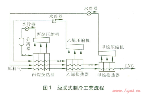 級聯(lián)式制冷工藝主要應(yīng)用于基本負(fù)荷型天然氣液化裝置。級聯(lián)式制冷工藝流程通常由三級獨立的制冷循環(huán)組成。第一級丙烷制冷循環(huán)為天然氣、乙烯和甲烷提供冷量;第二級乙烯制冷循環(huán)為天然氣和甲烷提供冷量;第三級甲烷制冷循環(huán)為天然氣提供冷量,天然氣的溫度逐步降低直至液化。第一級采用丙烷作制冷劑,經(jīng)過凈化后的原料氣在丙烷換熱器中冷卻到-35-40℃后進入第二級冷卻。由丙烷換熱器中蒸發(fā)出來的丙烷氣體經(jīng)壓縮機增壓,水冷器冷卻后重新液化,并循環(huán)到丙烷換熱器。第二級采用乙烯或乙烷作制冷劑,原料氣在第二級中被換熱到-80-l00℃,并被液化后進入第三級冷卻,由乙烯換熱器中蒸發(fā)出來的乙烯氣體經(jīng)壓縮機增壓,水冷器冷卻后,在丙烷換熱器中冷卻重新液化,并循環(huán)到乙烯換熱器。第三級采用甲烷作制冷劑,液化天然氣在甲烷換熱器中被過冷到-l50-163℃,然后通過節(jié)流閥降壓后,輸送到LNG儲罐儲存。甲烷換熱器中蒸發(fā)出來的氣體經(jīng)增壓、水冷后,在丙烷換熱器中冷卻、在乙烯換熱器中液化后,循環(huán)到甲烷換熱器。