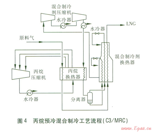 20世紀(jì)60年代建設(shè)的天然氣液化裝置,大部分采用當(dāng)時技術(shù)成熟的級聯(lián)式制冷工藝流程,到70年代又轉(zhuǎn)而采用流程大為簡化的混合制冷工藝液化流程。80年代后,新建與擴建的年產(chǎn)l00×104 ta LNG的基本負(fù)荷型天然氣液化裝置則幾乎無一例外地采用丙烷預(yù)冷混合制冷工藝液化流程(C3MRC循環(huán))。進人90年代后,混合制冷液化流程進一步發(fā)展,新開發(fā)的混合制冷工藝逐步得到應(yīng)用。
