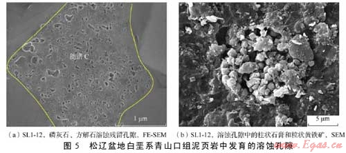 利用掃描電鏡和場發(fā)射掃描電鏡二次電子成像技術對松遼盆地主要生油層白堊系青山口組泥頁巖中發(fā)育的孔隙和微裂縫進行了系統(tǒng)的成像觀察,發(fā)現(xiàn)該套頁巖中主要發(fā)育了5種類型孔隙即基質(zhì)晶間孔、有機質(zhì)孔、溶蝕孔、粒間孔、晶內(nèi)孔及微米—亞微米級(納米級)微裂縫,微裂縫包括充填縫、溶蝕縫及層間縫。各種類型孔隙與微裂縫伴生發(fā)育,并可能彼此連通。這種復雜微裂縫網(wǎng)絡-孔隙系統(tǒng)的存在為油氣從烴源巖向外排驅(qū)提供了有效通道,同時也為滯留在泥頁巖中的部分油氣提供了有效的儲集空間。該套地層中各類型孔隙尺寸為納米—微米級,可能主要受頁巖基質(zhì)的微觀孔隙結(jié)構(gòu)、礦物組成、有機質(zhì)類型以及有機質(zhì)的熱演化程度等因素的影響。