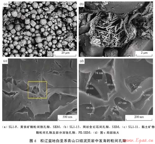 摘 要:為了查明泥頁巖系統(tǒng)微觀孔隙發(fā)育特征及其油氣地質(zhì)意義,利用掃描電鏡及場發(fā)射掃描電鏡二次電子成像技術對松遼盆地白堊系青山口組一段泥頁巖中的微觀孔隙進行了系統(tǒng)觀察。該套泥頁巖中主要發(fā)育了5種類型孔隙,即基質(zhì)晶間孔、有機質(zhì)孔、溶蝕孔、粒間孔、晶內(nèi)孔;此外,還發(fā)育大量微米—亞微米級(納米級)微裂縫,包括溶蝕縫、充填縫及層間縫3類。微孔隙和微裂縫構(gòu)成復雜微裂縫網(wǎng)絡-孔隙系統(tǒng),為烴源巖生成的油氣向外排驅(qū)提供了有效通道,同時也為殘留在頁巖中的油氣提供了充分的儲集空間,對于油氣的初次運移以及頁巖油氣等非常規(guī)資源的儲集具有重要意義。