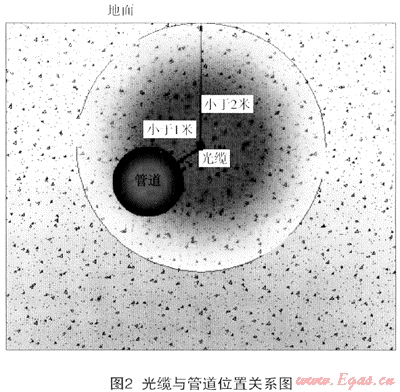 受當前儀器設(shè)備精度所限,只能分析出光纖橫截面為中心半徑2m內(nèi)振動聲音信號。即,光纜有效監(jiān)測半徑只有2m,所以,管道必須完全處在光纜為中心2m包絡(luò)線之內(nèi),否則將有部分管體受不到有效保護(如圖2)。