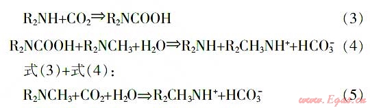 式(2)為瞬間可逆反應(yīng),而式(1)受液膜控制,反應(yīng)速率極慢,為控制步驟。為加快反應(yīng)速率,可向MDEA溶液中加入伯醇胺或仲醇胺,它們可與CO2快速反應(yīng)生成氨基甲酸酯,進(jìn)而激活MDEA,提高與CO2的反應(yīng)速率。目前較為認(rèn)可的反應(yīng)機(jī)理是穿梭傳遞,即伯醇胺或仲醇胺在界面和液相本體間穿梭傳遞CO2。以仲醇胺為例,在MDEA溶液中加人R2NH后,反應(yīng)按式(3)~(4)進(jìn)行: