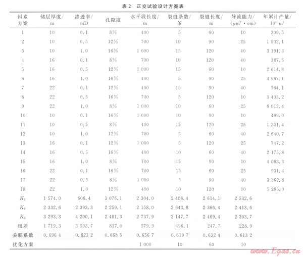 2)采用正交試驗(yàn)分析理論對(duì)氣藏壓裂水平井產(chǎn)能參數(shù)的影響程度進(jìn)行了分析,并運(yùn)用灰色關(guān)聯(lián)分析方法進(jìn)行了檢驗(yàn),找出了影響研究區(qū)塊壓裂水平井產(chǎn)能的主要參數(shù)排序依次為:地層滲透率、儲(chǔ)層厚度、孔隙度、水平段長(zhǎng)度、裂縫條數(shù)、裂縫長(zhǎng)度、導(dǎo)流能力。