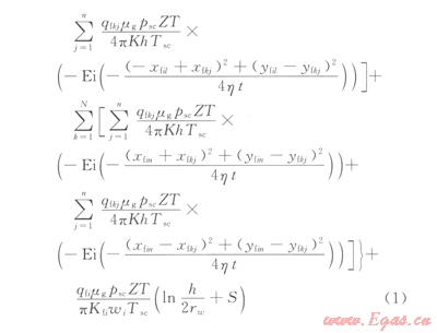 將裂縫單翼均等分成竹份,每等份可以看成是一個(gè)點(diǎn)匯。利用無(wú)限大均勻地層點(diǎn)匯定流量的壓降公式,可以求出該點(diǎn)匯對(duì)地層中任意一點(diǎn)產(chǎn)生的壓降[8-10];將地層任意一點(diǎn)替換為裂縫尖端,就可以得到所有點(diǎn)匯同時(shí)生產(chǎn)時(shí)對(duì)裂縫尖端產(chǎn)生的壓降;考慮到裂縫半長(zhǎng)遠(yuǎn)大于水平井筒半徑,裂縫內(nèi)流體從裂縫邊緣向井筒周?chē)奂?,?span lang="EN-US">i條裂縫可以看成是流動(dòng)直徑為裂縫長(zhǎng)度、地層厚度為裂縫寬度、邊界壓力為裂縫尖端壓力、井底流壓為水平井井筒內(nèi)壓力的微型平面徑向流油藏;根據(jù)壓力連續(xù)和流量守恒方程,就能得到考慮裂縫干擾的壓裂水平井油井產(chǎn)量預(yù)測(cè)模型[2,5];進(jìn)一步根據(jù)壓力函數(shù)的定義和真實(shí)氣體狀態(tài)方程,并將地層條件下的產(chǎn)量換算為地面標(biāo)準(zhǔn)情況下氣體產(chǎn)量,就可以得到氣藏壓裂水平井產(chǎn)量預(yù)測(cè)模型:
