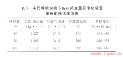 然后,分別在30、50和80個(gè)種群規(guī)模下運(yùn)行優(yōu)化程序。表5所示為不同種群規(guī)模下各決策變量及凈化裝置單位能耗優(yōu)化值。
