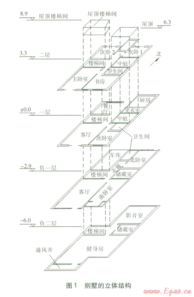 該建筑物共有21個主要功能房間(包含衛(wèi)生間、車庫、儲藏室等),兩個豎向氣流通道(樓梯間、中庭)。樓梯間是貫通負(fù)二層至屋頂?shù)娜诵型ǖ?。中庭從一層通至屋頂,類似于舊式建筑的天井,是與室外相通的空間。別墅的立體結(jié)構(gòu)見圖1,圖中各層標(biāo)高的單位為m。
