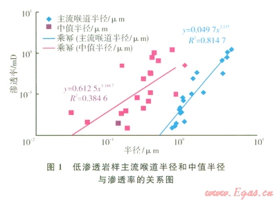喉道大小及分布是控制儲層滲流能力的關(guān)鍵。定義對滲透率累積貢獻達95%以前喉道半徑的加權(quán)平均值為主流喉道半徑。須家河組不同儲層巖樣主流喉道半徑和中值半徑與滲透率關(guān)系表明(1),主流喉道半徑隨滲透率的增加而增加,二者之間存在非常好的正相關(guān)關(guān)系;但是中值半徑與滲透率之間的相關(guān)性較差。這說明主流喉道半徑不僅能表征儲層基質(zhì)的滲透能力,而且能夠反映儲層微觀孔隙結(jié)構(gòu)特征。
