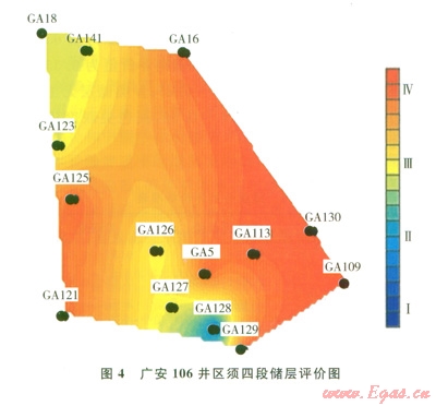 應(yīng)用儲層評價方法對廣安2井區(qū)須六段儲層和廣安106井區(qū)須四段儲層進行了分類評價(3、4)。從圖中可以看出,廣安2井區(qū)須六段儲層中部南北向儲層為Ⅰ、Ⅱ類儲層;向東、西兩翼發(fā)展儲層逐漸變差,為Ⅲ、Ⅳ類儲層。因而,中部南北向為氣藏富集區(qū),是氣藏開發(fā)的重點區(qū)域。廣安106井區(qū)須四段儲層整體為Ⅲ、Ⅳ類儲層,西北翼和南部儲層相對較好。
