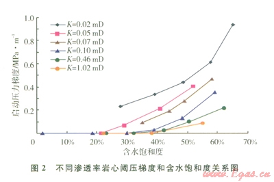 低滲透砂巖含水氣藏巖樣滲流實驗表明,當(dāng)含水飽和度較高時,氣體滲流出現(xiàn)非達西流現(xiàn)象,存在閾壓梯度[8]。閾壓梯度與巖心滲透率及含水飽和度相關(guān)(2),巖心滲透率越低,含水飽和度越高,閾壓梯度越大。閾壓梯度可作為衡量儲層流動性強弱的指標(biāo),也是影響儲量動用程度的重要參數(shù),因此,將閾壓梯度作為低滲含水儲層評價參數(shù)是必要的。