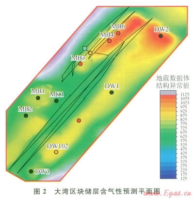 研究認(rèn)為,大灣區(qū)塊存在上下兩套地震數(shù)據(jù)體結(jié)構(gòu)特征異常段,上含氣層為飛仙關(guān)組,下含氣層為長(zhǎng)興組,主要呈北東一南西向分布。飛仙關(guān)組預(yù)測(cè)有利含氣面積49.0km2,長(zhǎng)興組預(yù)測(cè)有利含氣面積l3.3km2,全區(qū)為62.3km2。其中DW2和MB4、MB6井區(qū)為l類有利含氣區(qū),是培育高產(chǎn)井有利區(qū)域(圖2)。