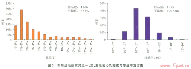 須三段儲集巖有砂巖、礫巖2種類型。砂巖儲層幾乎在全盆地均有分布,儲層孔隙度平均為4.43%,平均滲透率為0.25mD。以中壩地區(qū)物性最好,儲集巖主要為中粒巖屑石英砂巖、長石石英砂巖及巖屑砂巖,巖心平均孔隙度達(dá)7.52%,平均滲透率為0.3mD,粒間溶孔和粒內(nèi)溶孔發(fā)育。礫巖儲層僅分布在川西北劍閣地區(qū),礫石成分以碳酸鹽巖為主,礫間充填砂質(zhì),孔隙主要發(fā)育于基質(zhì)砂巖,孔隙度較低,主要分布在2%~4%。巖心與薄片觀察,裂縫發(fā)育,有時呈組出現(xiàn)或呈網(wǎng)狀,發(fā)育的裂縫溝通了低孔隙度礫巖儲層,改善了儲層的滲透性,孔隙與裂縫組成礫巖儲層儲集空間,形成“有效儲滲體” [15]。目前該區(qū)勘探發(fā)現(xiàn)多口工業(yè)氣井,表明孔隙度為2%~4%的砂礫巖,只要有裂縫的溝通,仍然可以形成有效儲層。平面上,儲層主要分布在川西地區(qū),以川西北劍閣—中壩地區(qū)最為發(fā)育,儲層厚度超過15m。