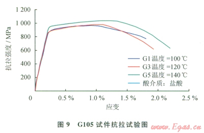 S135鋼、Gl05鋼在拉伸時(shí)應(yīng)變?cè)囼?yàn)見(jiàn)圖8、9,S135鋼在鹽酸中酸化后的抗拉強(qiáng)度均值為l091MPa(鉆桿APl標(biāo)準(zhǔn)要求S135最小抗拉強(qiáng)度為1000MPa);Gl05鋼在鹽酸介質(zhì)中酸化后的抗拉強(qiáng)度均值為994.8MPa(鉆桿API標(biāo)準(zhǔn)要求Gl05最小抗拉強(qiáng)度為793MPa)。因此可以看出,Sl35鋼和Gl05鋼在鹽酸中腐蝕后,抗拉強(qiáng)度仍然能滿足工程需要。
