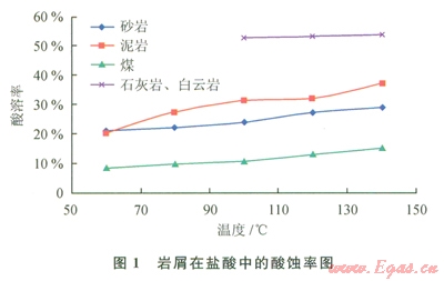 酸液對(duì)白云巖、石灰?guī)r的酸化效果最好,酸蝕率超過(guò)50%,其次是泥巖;酸液對(duì)鉆井液泥餅同樣具有一定的酸溶率,在20%~40%之間。土酸整體的酸化效果優(yōu)于鹽酸,但差距較小。溫度越高,酸化效果越好。因此,在鉆遇易酸化地層時(shí)出現(xiàn)卡鉆事故時(shí)[2],理論上采用浸泡酸化解卡液的辦法是可行的[3]。