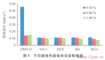 酸化緩蝕劑一般屬高分子有機(jī)化合物,這種化合物由極性基團(tuán)和非極性基團(tuán)構(gòu)成,可在金屬表面做定向吸附,形成分子界面膜,阻擋腐蝕介質(zhì)接觸金屬表面,達(dá)到保護(hù)設(shè)備,減緩腐蝕的目的[6]。能夠迅速有效地阻止酸性介質(zhì)對(duì)設(shè)備的侵蝕,對(duì)單酸(鹽酸、氫氟酸、磷酸)和復(fù)合酸均有良好的緩蝕效果。酸化解卡液選用鹽酸作為基液。因此,必須考慮鹽酸對(duì)現(xiàn)場(chǎng)設(shè)備的腐蝕問(wèn)題。通過(guò)加入一定量鹽水緩蝕劑來(lái)抑制鹽酸對(duì)金屬設(shè)備的腐蝕。在一定實(shí)驗(yàn)條件下分別考察5種緩蝕劑加量(圖4)在0.5%、0.8%和l.0%的情況下對(duì)金屬掛片的腐蝕性來(lái)評(píng)價(jià)其緩釋性能。