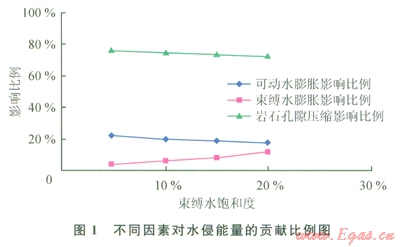 為了定量認(rèn)識前述3種岡素對水侵能量的影響程度,參照開展過相關(guān)研究的實(shí)際氣藏情況,計(jì)算預(yù)測不同束縛水飽和度條件下地層壓力從原始狀態(tài)的60MPa降到l0MPa后可動(dòng)水彈性膨脹、束縛水膨脹及儲層孔隙壓縮引起的體積變化在水區(qū)總體積變化巾所占比例(圖1)。結(jié)果顯示,地層壓力降低后儲層孔隙壓縮效應(yīng)對水侵能量的貢獻(xiàn)比例最高,因此依據(jù)式(3)可得到估算極限水侵量在可動(dòng)水體儲量中所占比例的近似公式。