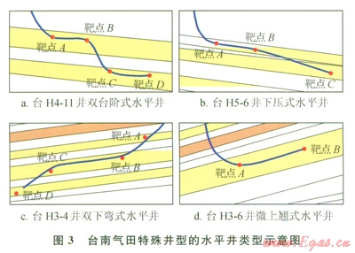臺南氣田整體開發(fā)建產(chǎn)期間共完成水平井43口中,總進(jìn)尺9.25×104m,水平段長104~1019m,水平段鉆遇氣層平均長度623.5m,氣層平均鉆遇率92.12%,完井方式均采用篩管完井。為提高氣層動用個(gè)數(shù),實(shí)施特殊井型水平井11口,其中水平段為雙臺階的4口、雙下彎式的1口、下壓式的5口井、微上翹式的1口,氣層平均鉆遇率為94.8%。