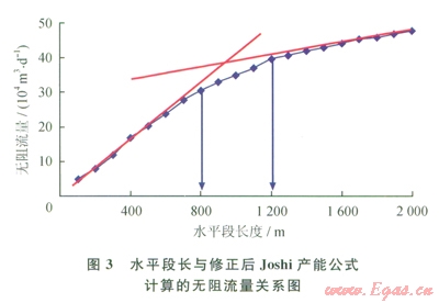 蘇里格氣田水平井開發(fā)主力層為盒8段儲(chǔ)層,屬辮狀河沉積,河道遷移迅速,砂體在平面上和縱向上交替疊置。統(tǒng)計(jì)結(jié)果表明,砂巖鉆遇率多在70%以上,但有效砂體規(guī)模小,連續(xù)性和連通性差,鉆遇率多數(shù)小于50%。蘇l4井區(qū)、蘇6井區(qū)及蘇l0井區(qū)進(jìn)行的加密井網(wǎng)試驗(yàn)表明:有效單砂體厚度一般為2~6m,寬度400~800m,長(zhǎng)度900~1200m,以孤立型、切割疊置型、堆、積疊置型、橫向局部連通型賦存于地層中,僅在局部疊置規(guī)模較大。通過對(duì)盒8段為目標(biāo)層的233口水平井分析表明:平均有效儲(chǔ)層鉆遇率僅59.91%;單層有效砂體長(zhǎng)度小,僅l0口井l00%鉆遇有效砂體,其中7口井長(zhǎng)度大于l000m,最長(zhǎng)ll72m;96%井鉆遇多套砂體,泥巖段長(zhǎng)度大于50m的有l86口。表明砂巖在空間分布不均,非均值性強(qiáng)。水平段長(zhǎng)度、砂體長(zhǎng)度、有效儲(chǔ)層長(zhǎng)度三者正相關(guān),表明:水平段長(zhǎng)度越長(zhǎng),溝通多個(gè)砂體的機(jī)率更高;在800~1200m范圍內(nèi)儲(chǔ)層鉆遇率高(圖2),鉆穿多套砂體的有效儲(chǔ)層鉆遇率明顯下降;根據(jù)對(duì)已生產(chǎn)井的動(dòng)態(tài)分析,水平段長(zhǎng)度與井控儲(chǔ)量、無阻流量不呈線性增長(zhǎng)關(guān)系;應(yīng)用l6口生產(chǎn)時(shí)間較長(zhǎng)的水平井修正了Joshi非均質(zhì)氣藏水平氣井產(chǎn)能公式,進(jìn)而進(jìn)行計(jì)算后表明,隨著水平段長(zhǎng)度增加,無阻流量增加的幅度變緩,且在800~1200m出現(xiàn)拐點(diǎn)(圖3);動(dòng)靜態(tài)資料證明有效砂體在單層范圍內(nèi)展布局限,水平段長(zhǎng)度并非越長(zhǎng)產(chǎn)量越高。