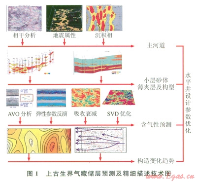 該技術(shù)依據(jù)二維地震連片處理成果優(yōu)選出富集區(qū);通過地震相干體分析和屬性提取,疊加實(shí)鉆資料繪制的沉積相圖描繪出富集區(qū)內(nèi)的主河道;氣藏精細(xì)描述刻畫出小層砂體、薄夾層及構(gòu)型;運(yùn)用AV0分析,彈性參數(shù)反演,吸收衰減,SVD優(yōu)化等地震分析技術(shù)定量預(yù)測(cè)擬動(dòng)用儲(chǔ)層的含氣性;地震預(yù)測(cè)構(gòu)造趨勢(shì)與實(shí)鉆資料繪制構(gòu)造圖印證,分析鉆探方向構(gòu)造變化;定性描述和定量描述相結(jié)合,優(yōu)化設(shè)計(jì)參數(shù)(圖1)。