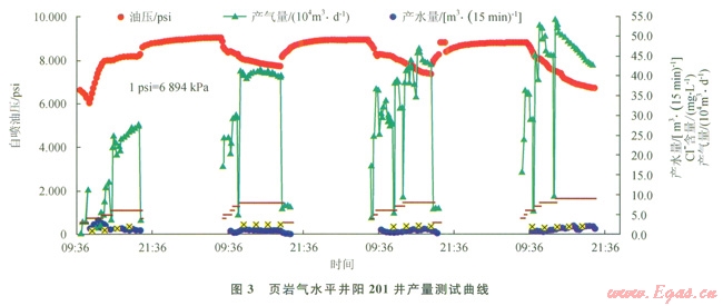 中國(guó)石油天然氣股份有限公司(以下簡(jiǎn)稱中國(guó)石油)已在四川的長(zhǎng)寧、威遠(yuǎn)、富順、永川,云南昭通等開展頁(yè)巖氣勘探開發(fā)。其中我國(guó)第一口頁(yè)巖氣水平井——威201-H1井于位于四川盆地南部,2011年2月完鉆,井深2835.6m,水平段長(zhǎng)1079m;分11段壓裂,加石英砂584.6m3,入地總液量23654m3,井下微地震監(jiān)測(cè)顯示,初步達(dá)到了規(guī)模體積壓裂的效果,目前日產(chǎn)氣量l3×104m3。中石油與殼牌合作區(qū)塊的水平井陽201井,測(cè)試平均日產(chǎn)氣量為45.0×104m3,井口套壓48.3MPa,表現(xiàn)出良好的高產(chǎn)潛力(圖3)。