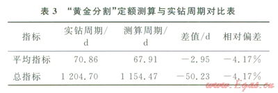 塔里木油田輪南區(qū)塊近4年共完鉆井18口,按照鉆井定額編制原則,選出17口與標準井井型類似的基礎井,編制該區(qū)塊鉆井周期定額。定額測算周期與實際鉆井周期對比結果見表3??梢钥闯觯捎?span lang="EN-US">“黃金分割”測算出的平均單井鉆井周期比實際統(tǒng)計周期縮短2.95d,定額相對偏差為4.17%,滿足工程實踐需要。
