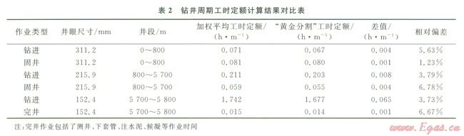 根據(jù)塔里木油田輪南區(qū)塊已鉆井不同井段的樣本數(shù)量,分別采用“3、5、2”分段加權平均法和“黃金分割”法,編制出該區(qū)塊鉆井周期工時定額,并對比分析兩種方法的先進程度(表2)。從計算結果可以看出,采用“黃金分割”測算的鉆井周期工時定額值比“3、5、2”分段加權平均法測算值要先進l.23%~678%。顯然,采用“黃金分割”法測算的鉆井周期工時定額精度要優(yōu)于“3、5、2”分段加權平均法。