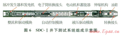 中國石油大慶鉆探工程公司鉆井T程技術(shù)研究院于2009年5月研制完成了SDC-I型隨鉆地層壓力測試器[16],并進(jìn)行了6口井的現(xiàn)場試驗(yàn),收到了較好的效果。該測試器分為井下測試系統(tǒng)、地面信息接收及處理系統(tǒng)兩部分。井下測試系統(tǒng)(圖6)負(fù)責(zé)完成地層壓力的測試并存儲(chǔ)和上傳數(shù)據(jù),地面信息接收及處理系統(tǒng)負(fù)責(zé)對數(shù)據(jù)進(jìn)行接收和處理?,F(xiàn)場試驗(yàn)表明,該測試器設(shè)計(jì)合理,可靠性高,壓力測量精度達(dá)到0.1%,溫度測量精度達(dá)到±0.5℃,井下供電功率達(dá)到l60W??呻S鉆實(shí)現(xiàn)數(shù)據(jù)上傳和井下存儲(chǔ)功能,地面可隨鉆獲取井下準(zhǔn)確的環(huán)空壓力、溫度、地層壓力和地層流度(地層流度表示流體在該地層中流動(dòng)的難易程度。是油層有效滲透率與流體黏度的比值)。經(jīng)過一年半的推廣,SDC-I目前共完成12口井的現(xiàn)場測試工作,井下測試最高壓力47.02MPa,最高溫度109.7℃。這種測試器已初步具備商業(yè)化應(yīng)用的條件[17]。