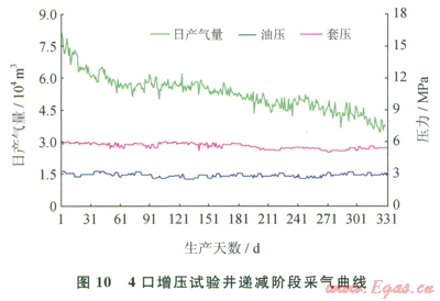 C井區(qū)投產(chǎn)井9口,2007年1月開始增壓生產(chǎn),截止到2006年12月,歷年累計產(chǎn)氣3.9526×108m3,地質(zhì)儲量采出程度3.49%。2009年3月增壓穩(wěn)產(chǎn)期結(jié)束,進(jìn)入增壓產(chǎn)量遞減階段。