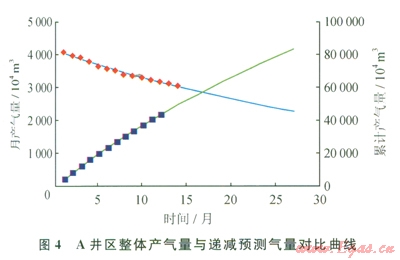 多數(shù)單井遞減率接近20%,l4口單井產(chǎn)量遞減類型符合指數(shù)遞減,6口單井產(chǎn)量遞減類型符合調(diào)和遞減。如Al2井,初始產(chǎn)量為249.0577×104m3,初始遞減率為0.0184,年遞減率19.83%(圖5、6),產(chǎn)能遞減方程為: